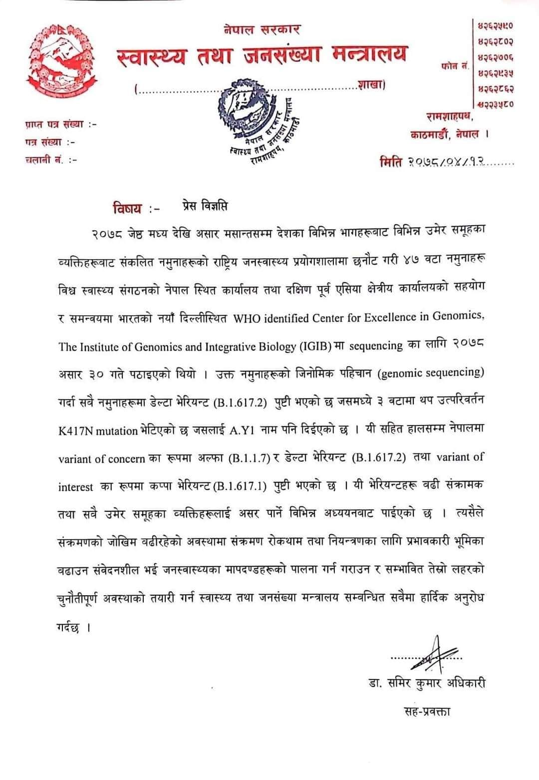 नेपालमा अहिले पछिल्लो पटक भेटिएको भेरियन्ट बढी संक्रामक रहेको र सबै उमेर समूहका व्यक्तिहरुलाई असर पार्ने अध्ययनबाट पाइएको छ । “त्यसैले संक्रमणको जोखिम बढिरहेको अवस्थामा संक्रमण रोकथाम तथा नियन्त्रणका लागि प्रभावकारी भूमिका बढाउन संवेदनशील भई जनस्वास्थ्यका मापदण्डहरुको पालना गर्न गराउन र सम्भावित तेस्रो लहरको चुनौतीपूर्ण अवस्थाको तयारी गर्न स्वास्थ्य तथा जनसंख्या मन्त्रालय सम्बन्धित सबैमा हार्दिक अनुरोध गर्दछ,” विज्ञप्तिमा भनिएको छ ।