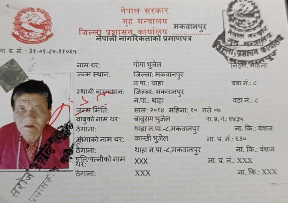 मकवानपुर थाहा नगरपालिका वडा नम्बर ८ आग्राकी ६७ वर्षिया गोमा भुजेलले नागरिकता पाउनु भएको छ । थाहा नगरपालिका वडा नम्बर ८ आग्रा खानीखोलाकी गोमालाई ८ नम्बर वडाध्यक्ष हेमकुमार थिङ र स्थानीय दुतराज थिङको विशेष पहलमा जिल्ला प्रशासन कार्यालय मकवानपुरको टोलीले घरैमा पुगेर नागरिकता वितरण गरेको हो ।
